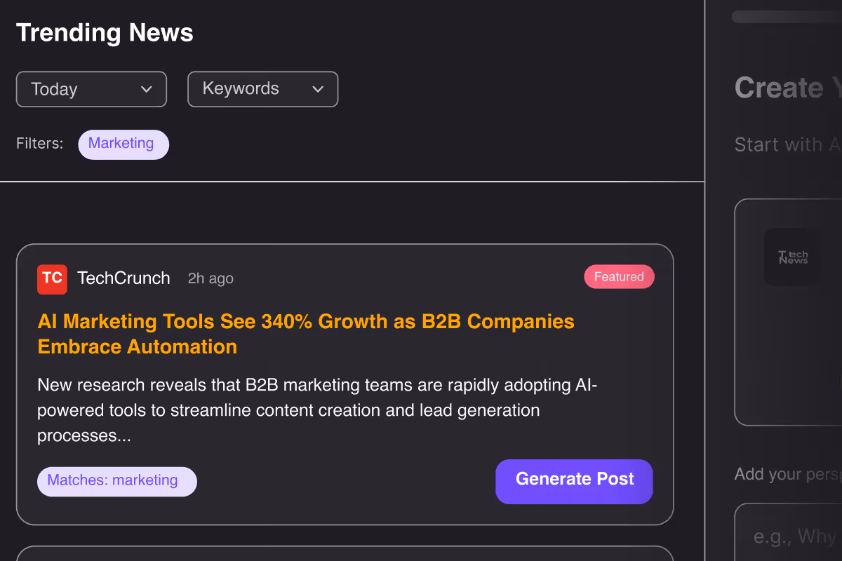 Posts are generated by AI but shaped by the person sharing them. Each team member adds their own perspective before publishing — keeping content genuine, personal, and far more engaging than anything that sounds like it came from a template.